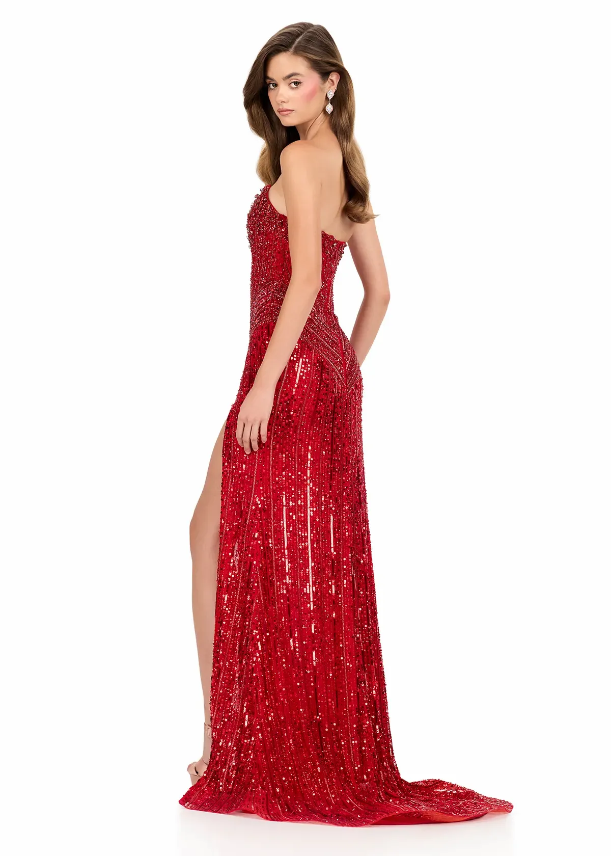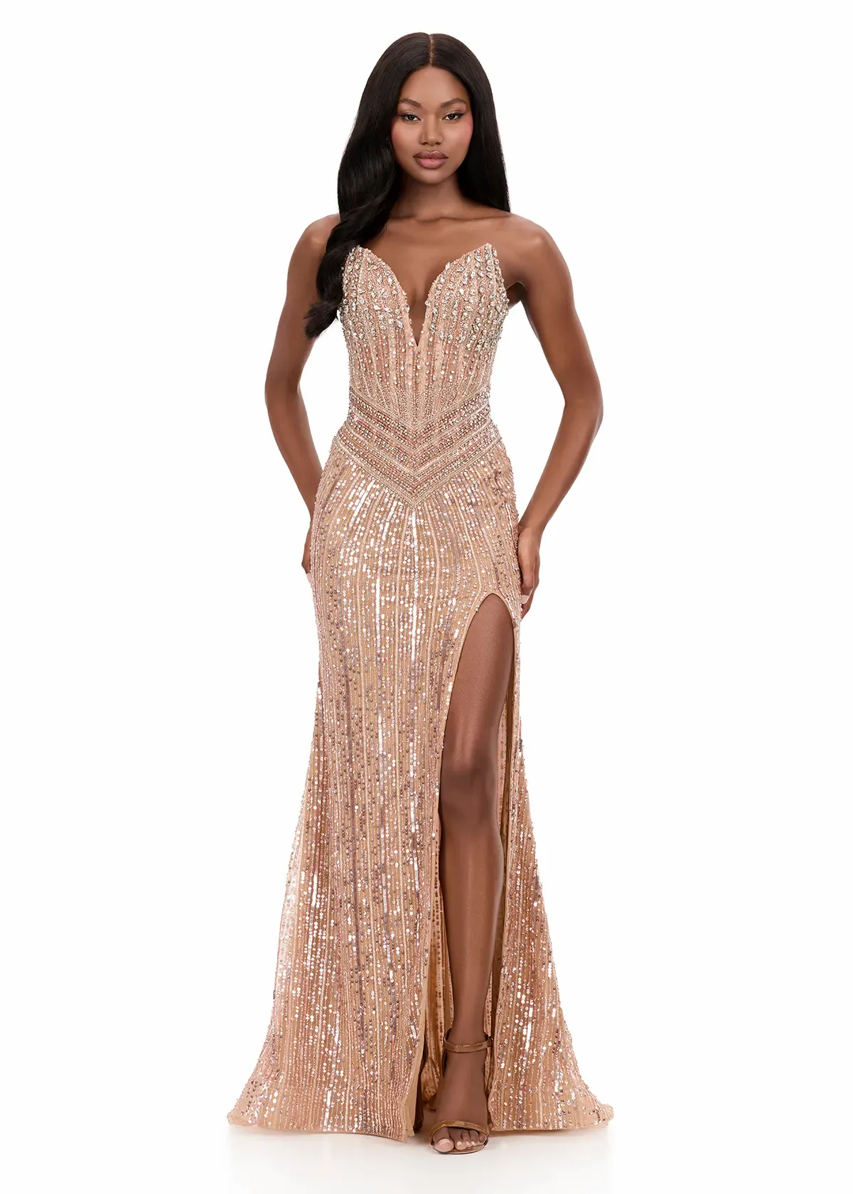 Be striking and sophisticated in this ASHLEYlauren Style 12274 fully beaded fitted gown designed to deliver maximum sparkle. The sculpted sweetheart bodice enhances the neckline while the intricate beading elongates and contours the silhouette. A thigh-high slit adds movement and bold appeal, and the sweep train creates a stunning finish from every angle. This style blends high-glam elegance with impeccable craftsmanship.