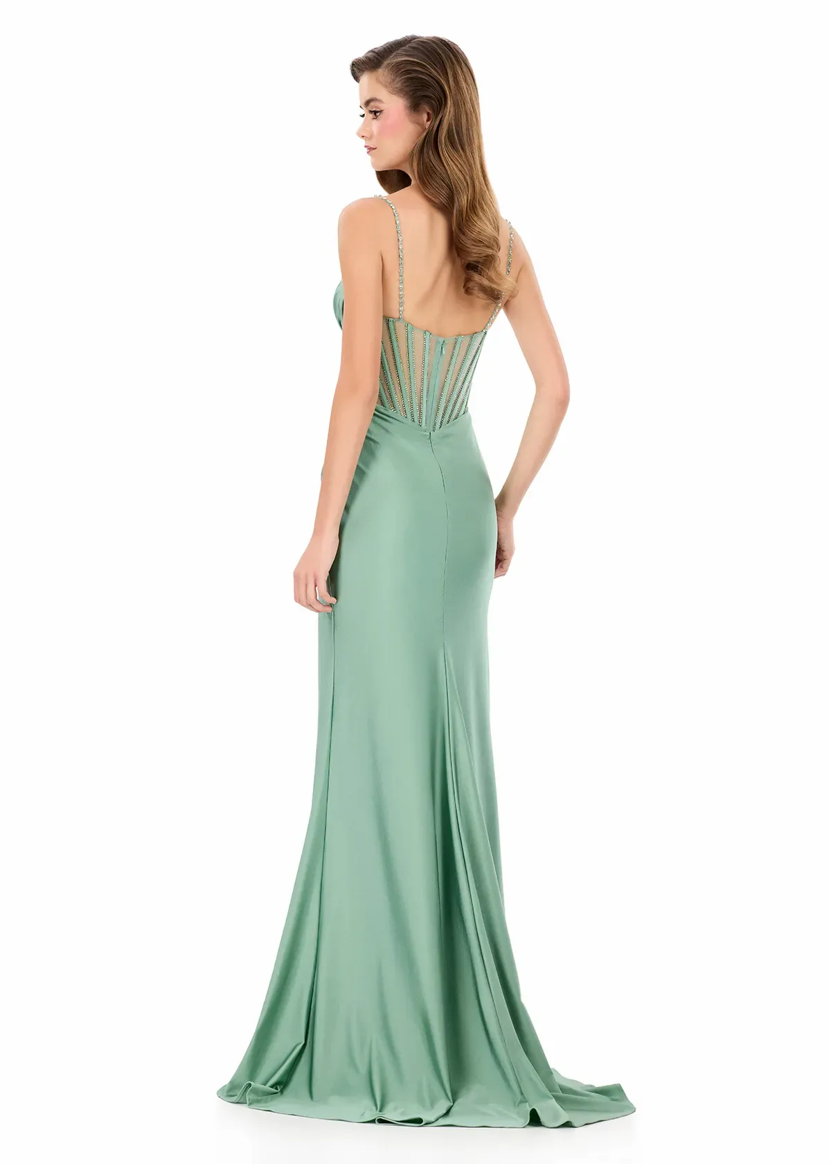 Step into sophistication with this sleek and elegant jersey gown, ASHLEYlauren Style 12173. Featuring a beaded bustier-style bodice with delicate spaghetti straps, this fitted dress highlights your figure with a ruched waist and flattering draped skirt. The corset detailing adds structure and sparkle, while the sweeping train ensures a glamorous finish. Perfect for prom, pageant, or any formal event, this gown brings modern allure and timeless elegance together.