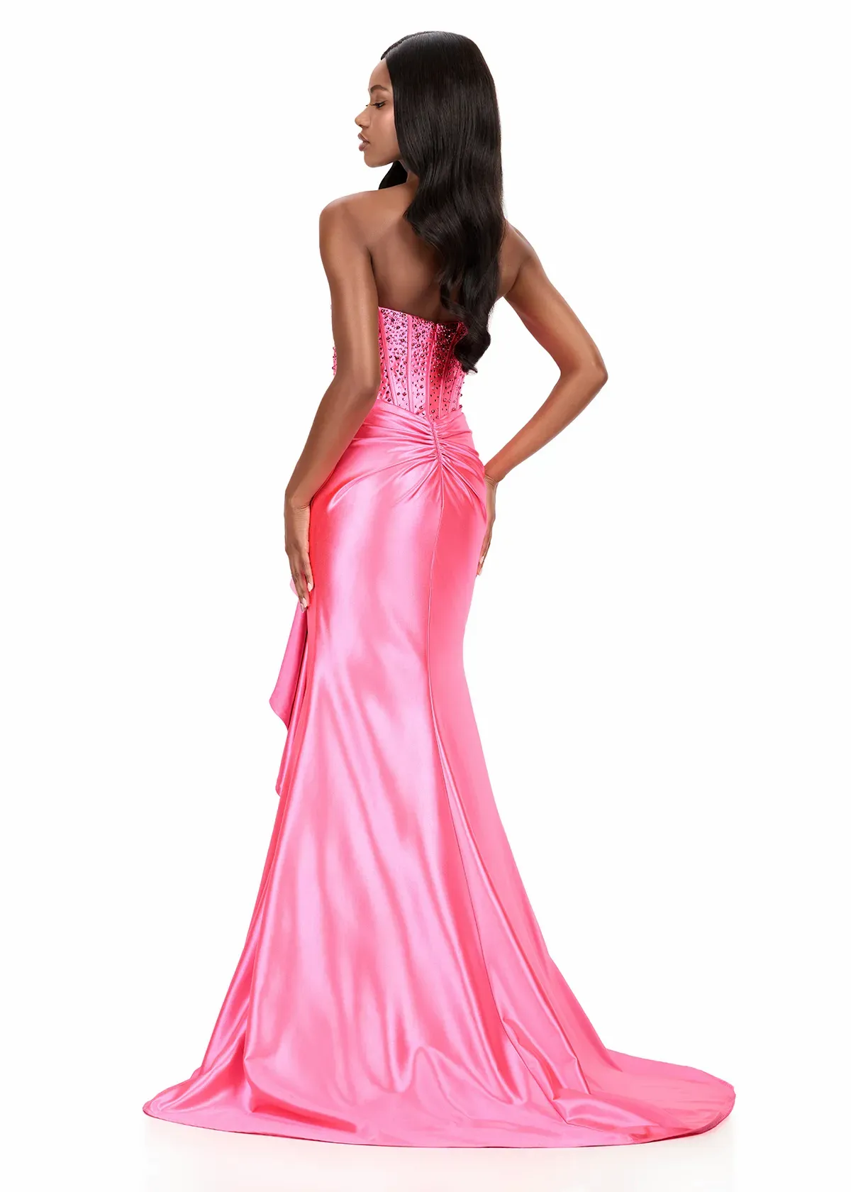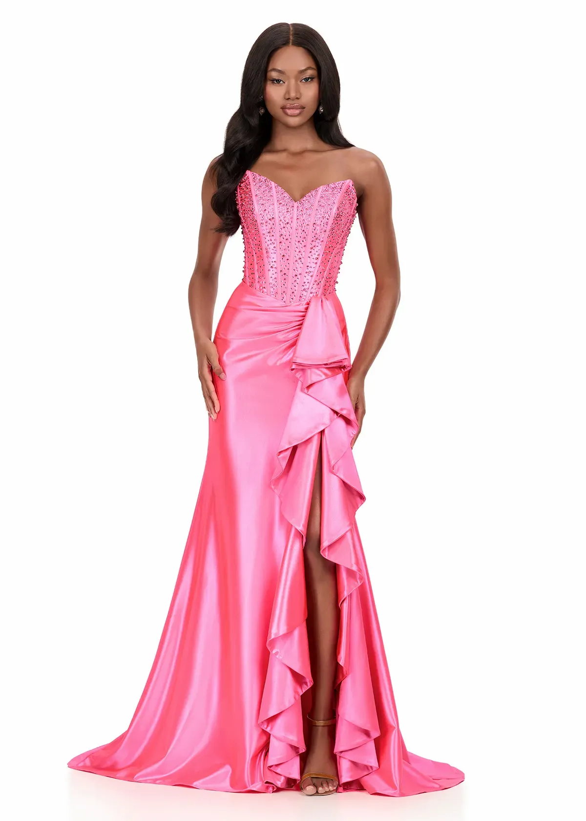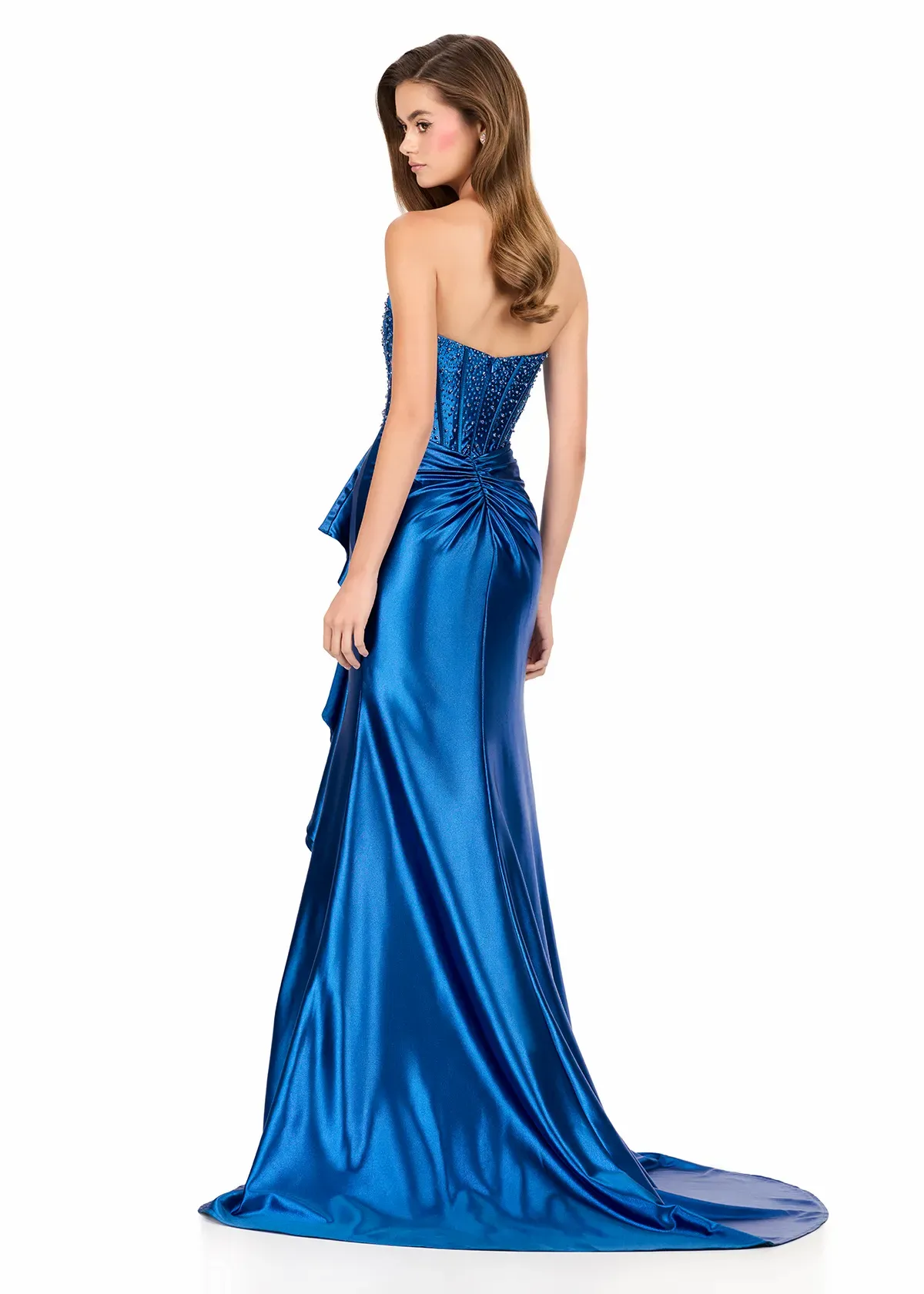 ASHLEYlauren Style 12240 is a glamorous fitted gown designed to accentuate your shape while delivering high-impact shine. The strapless sweetheart bodice features intricate ruching and a shimmering finish, while the skirt showcases a thigh-high slit framed with cascading ruffle details. Crafted from luxe shimmer jersey, this gown blends comfort, structure, and red-carpet drama.