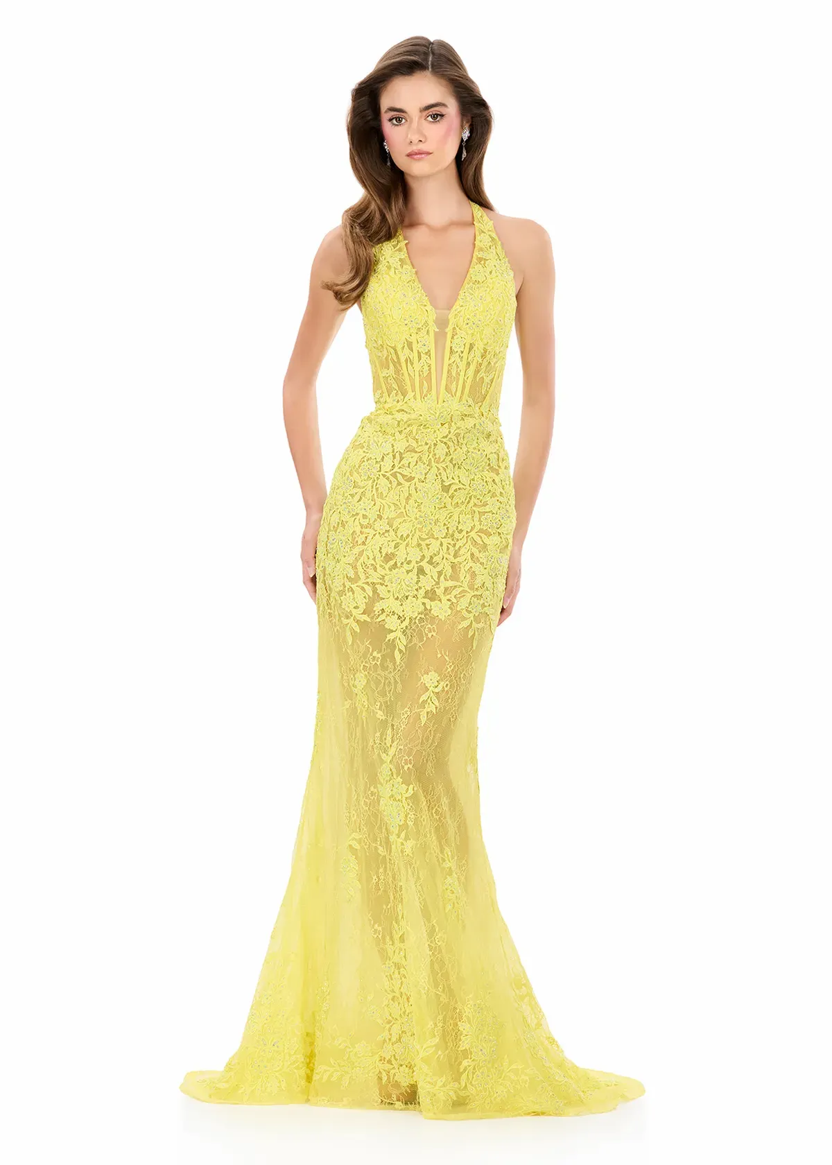 Radiate confidence in this ASHLEYlauren Style 12255 fitted lace gown crafted with intricate applique detailing from bodice to hem. The plunging neckline and structured bodice highlight the figure, while the dramatic open back adds a bold touch. The lace overlay creates texture and depth, and the sweep train completes the silhouette with soft, elegant movement—perfect for leaving a lasting impression on stage or at any formal event.