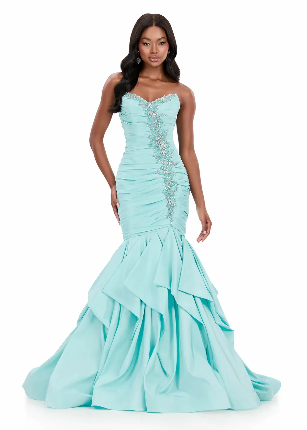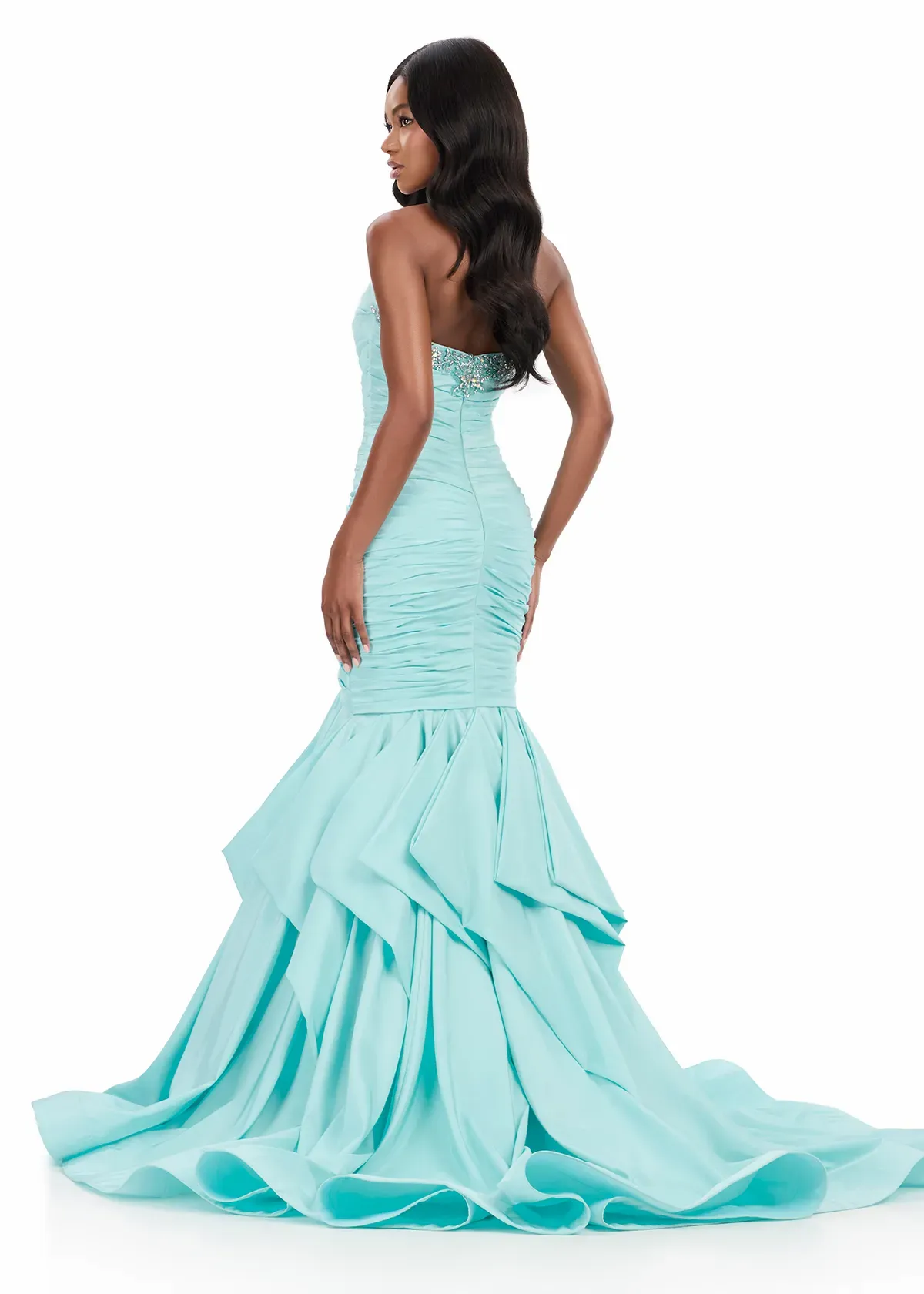 This sophisticated and sculpted taffeta mermaid gown is designed to contour and captivate. The ruched bodice on ASHLEYlauren Style 12301 enhances the silhouette, while layered ruffles cascade into a voluminous mermaid skirt for added drama. Sparkling embellishment along the neckline elevates the look with glamorous detail, making this gown unforgettable from every angle.