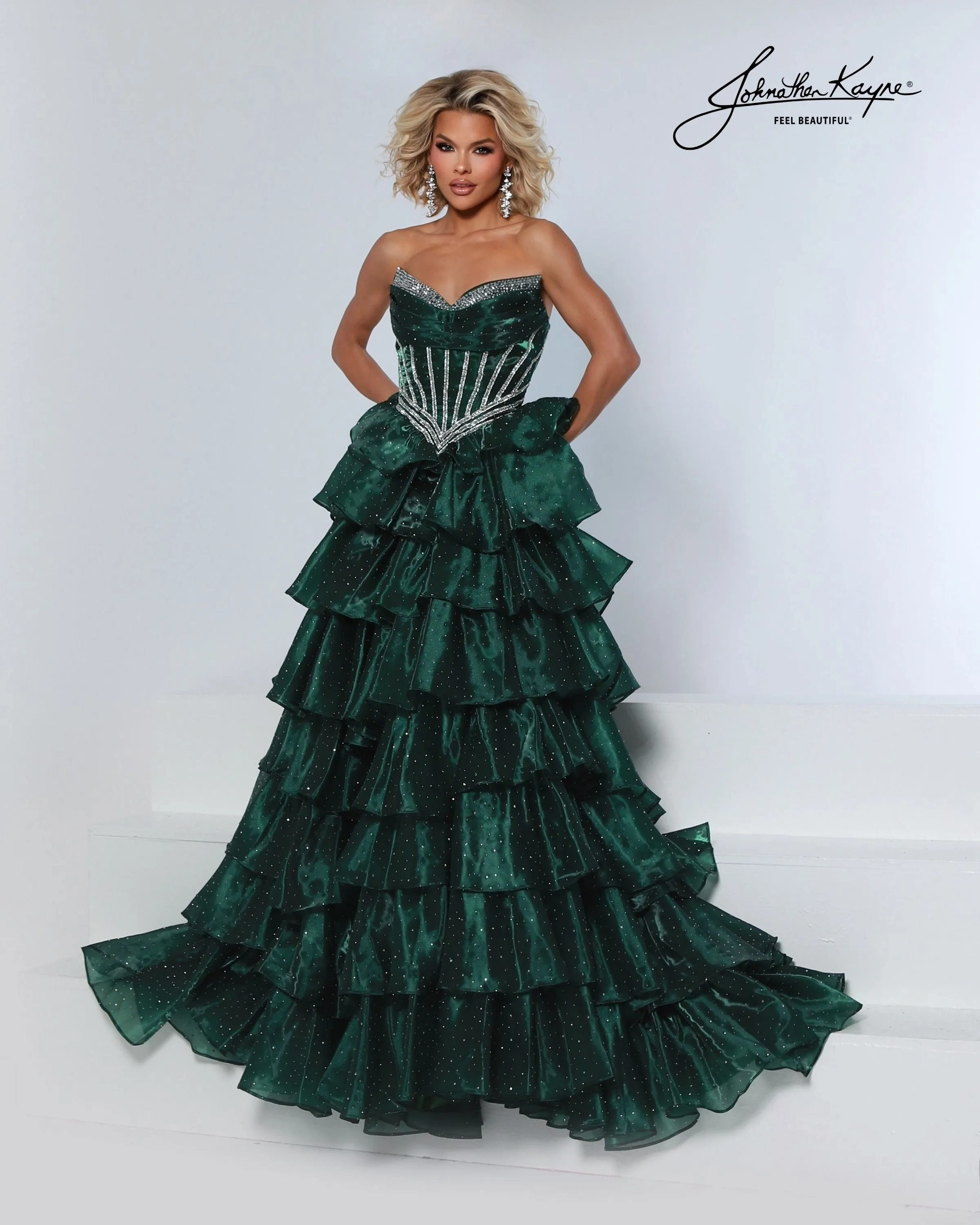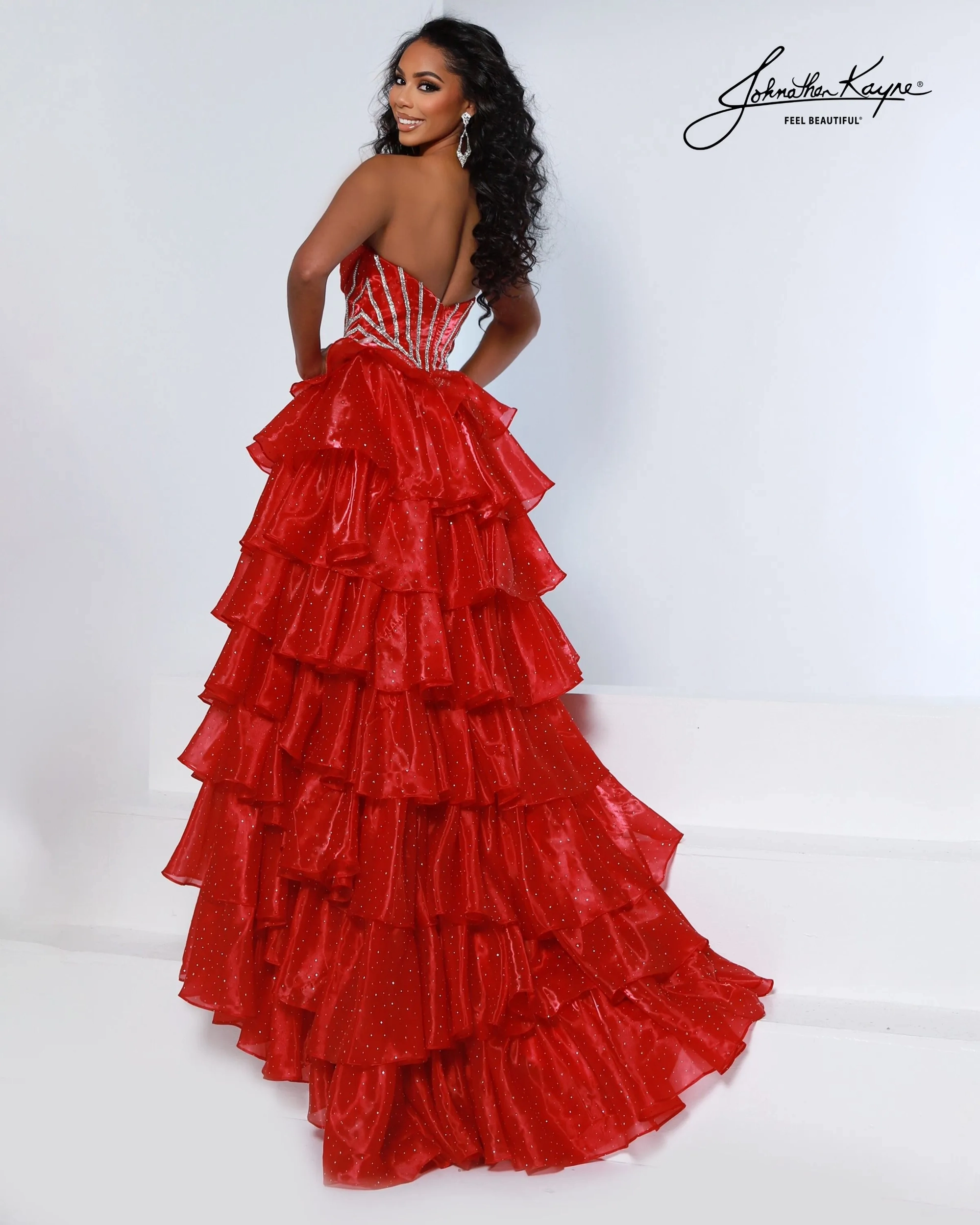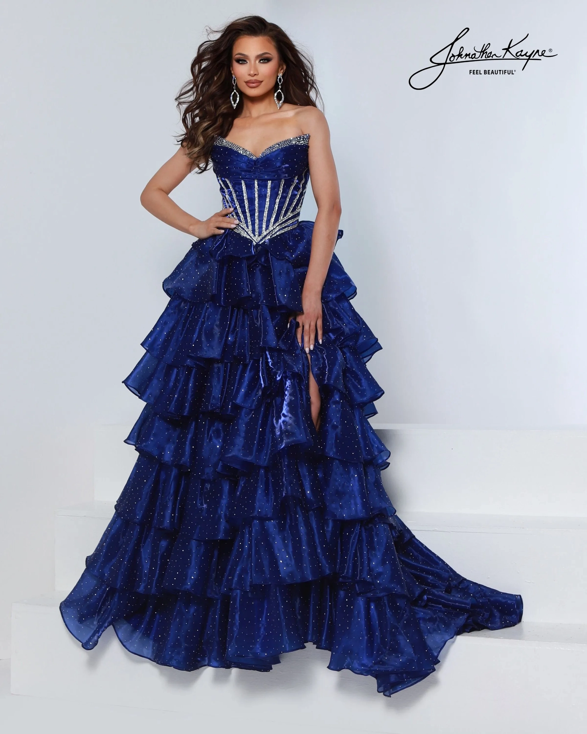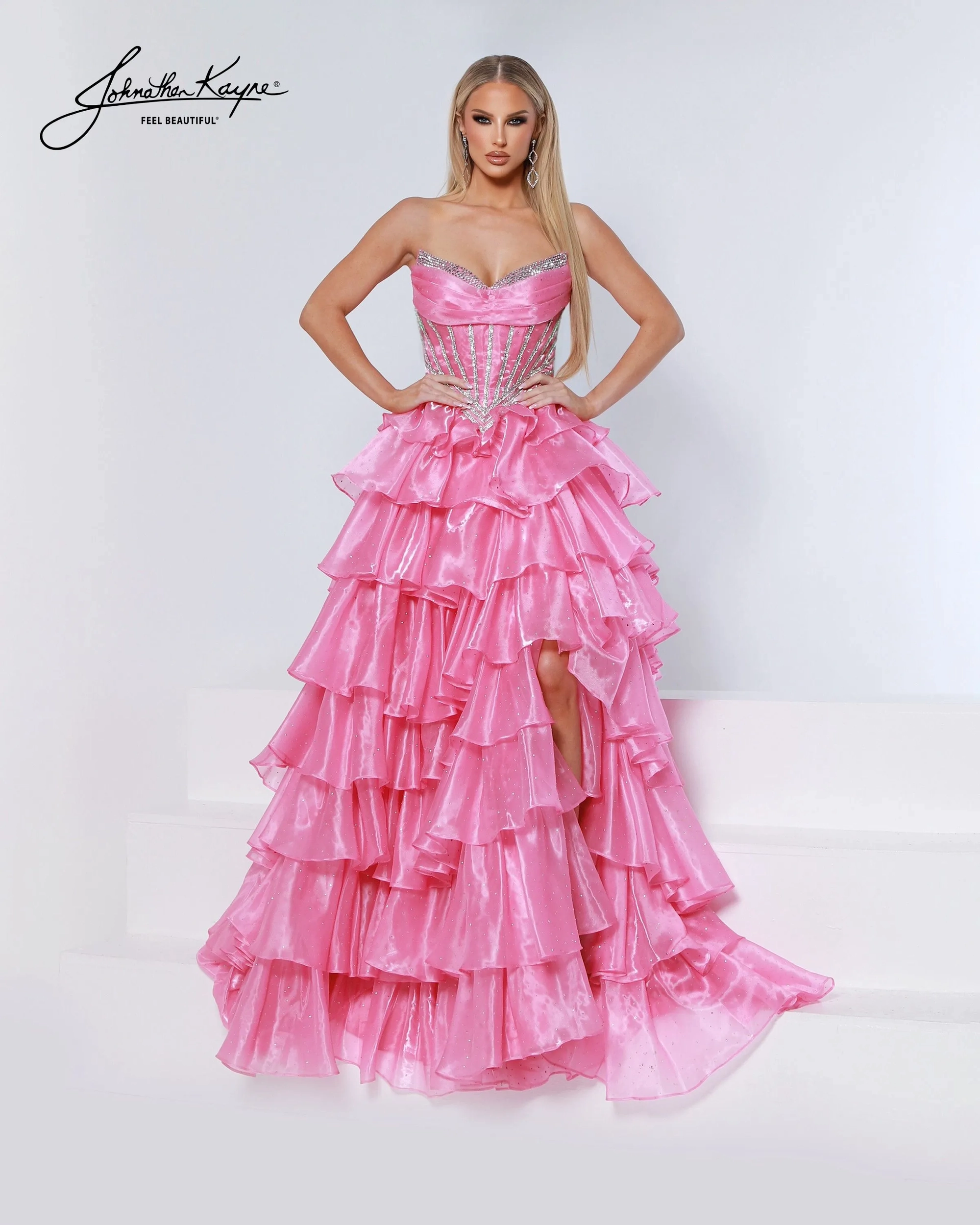 Bring the drama in this tiered mirror organza ballgown with a strapless crystal-detailed corset bodice. The playful tiered layers and thigh-high slit make it a dream dress for prom night, homecoming court, or teen pageant.
