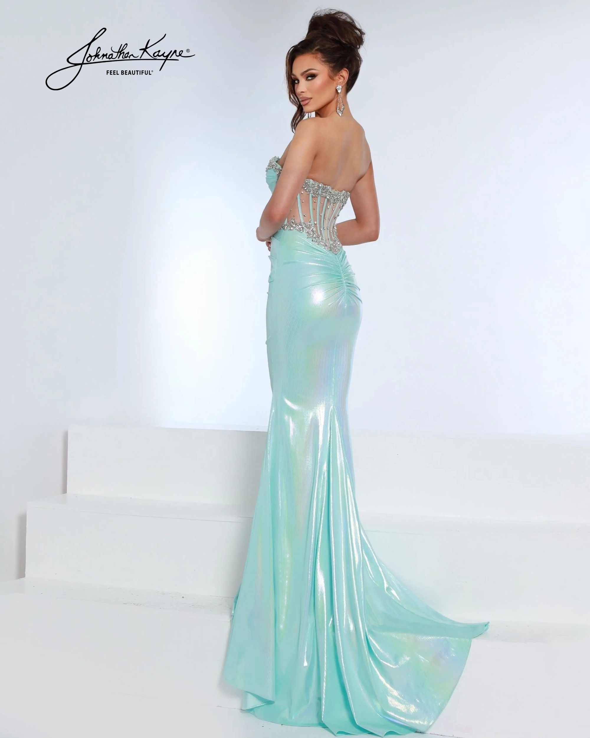 Shimmer and shine in this strapless iridescent jersey gown with a sweetheart crystal-embellished neckline. The sheer corset bodice and side slit make it a fun, flirty choice for prom or formal event.