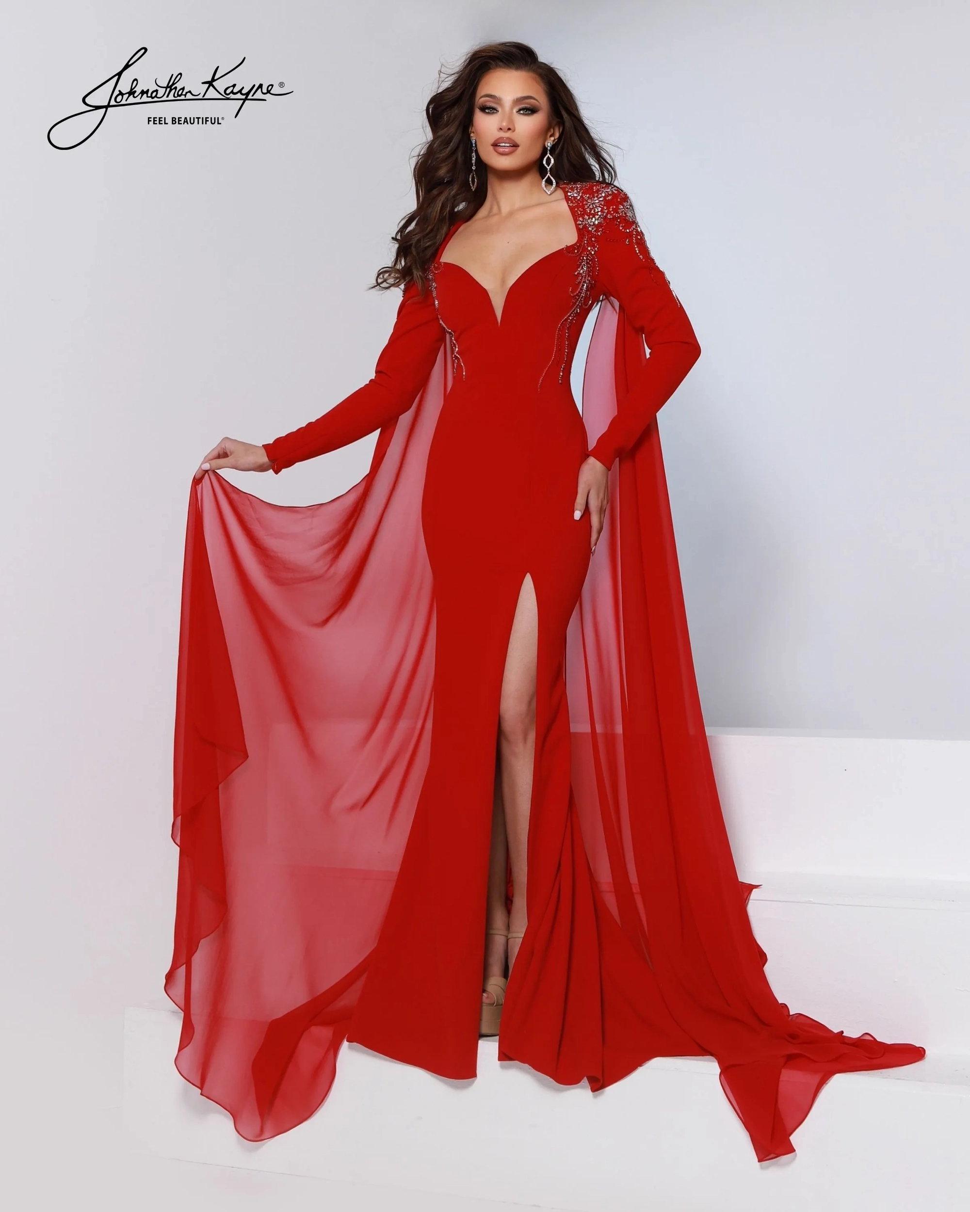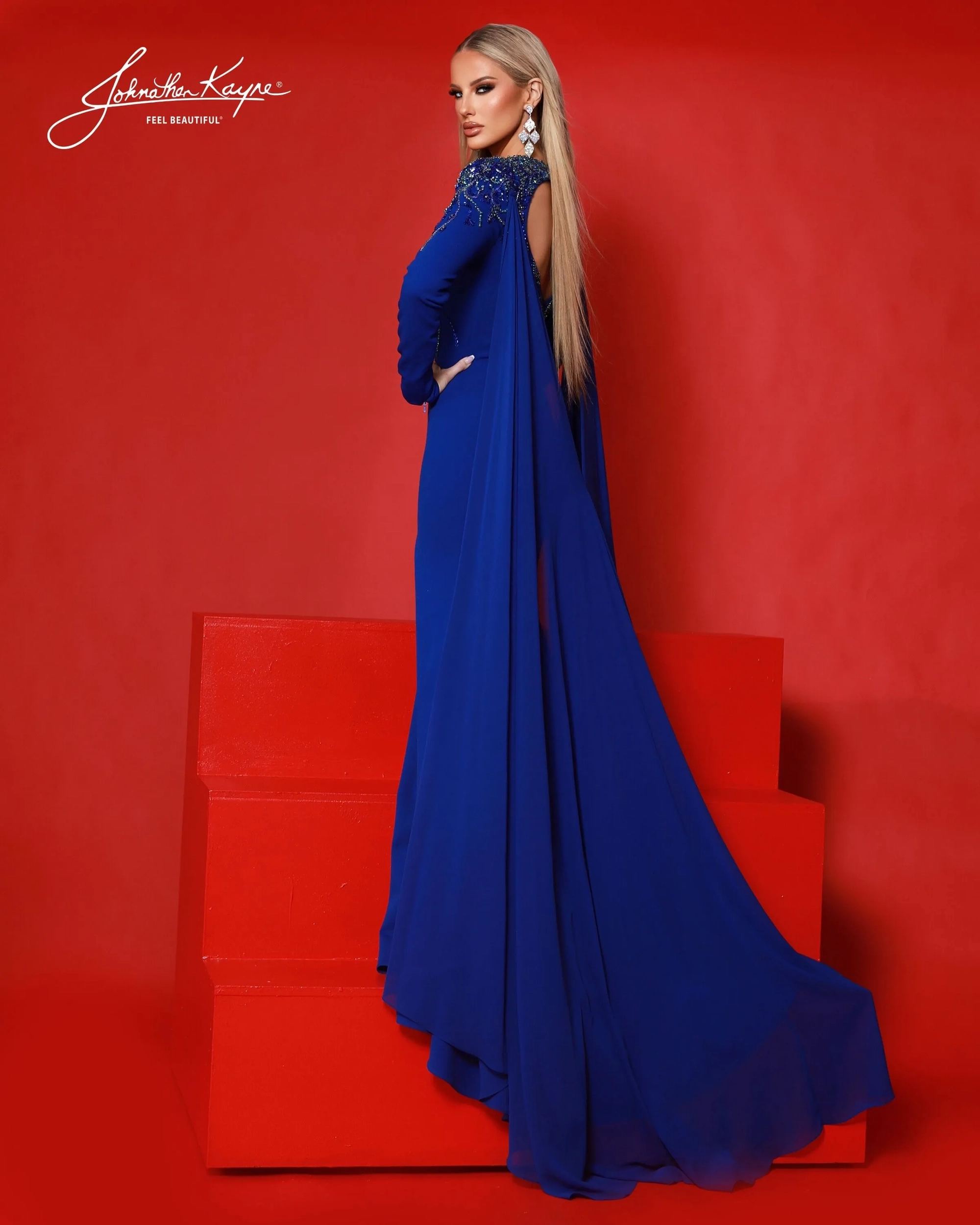 Command the room in pure sophistication. This long sleeve stretch crepe gown features crystal encrusted shoulders, a deep v neckline, and detachable chiffon cape. The slit adds a modern touch to its timeless silhouette. Perfect for pageant stages or formal galas.