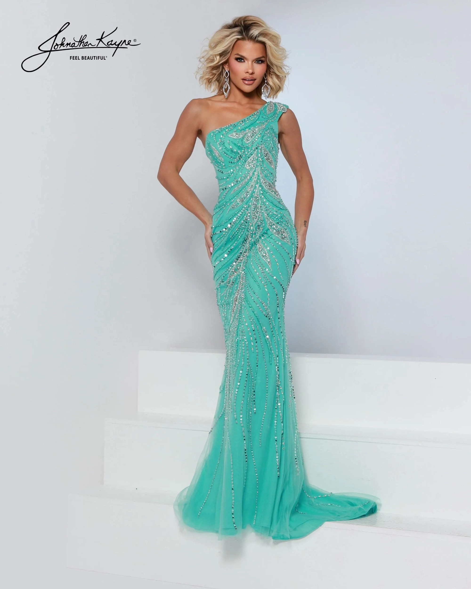 Own the moment in this one-shoulder gown shimmering with intricate crystal and pearl beadwork. The dramatic detachable shoulder drape and chiffon cape flows with every step, while the fitted silhouette ensures a flattering finish. Perfect for prom, homecoming night, special occasions and to the pageant stage.