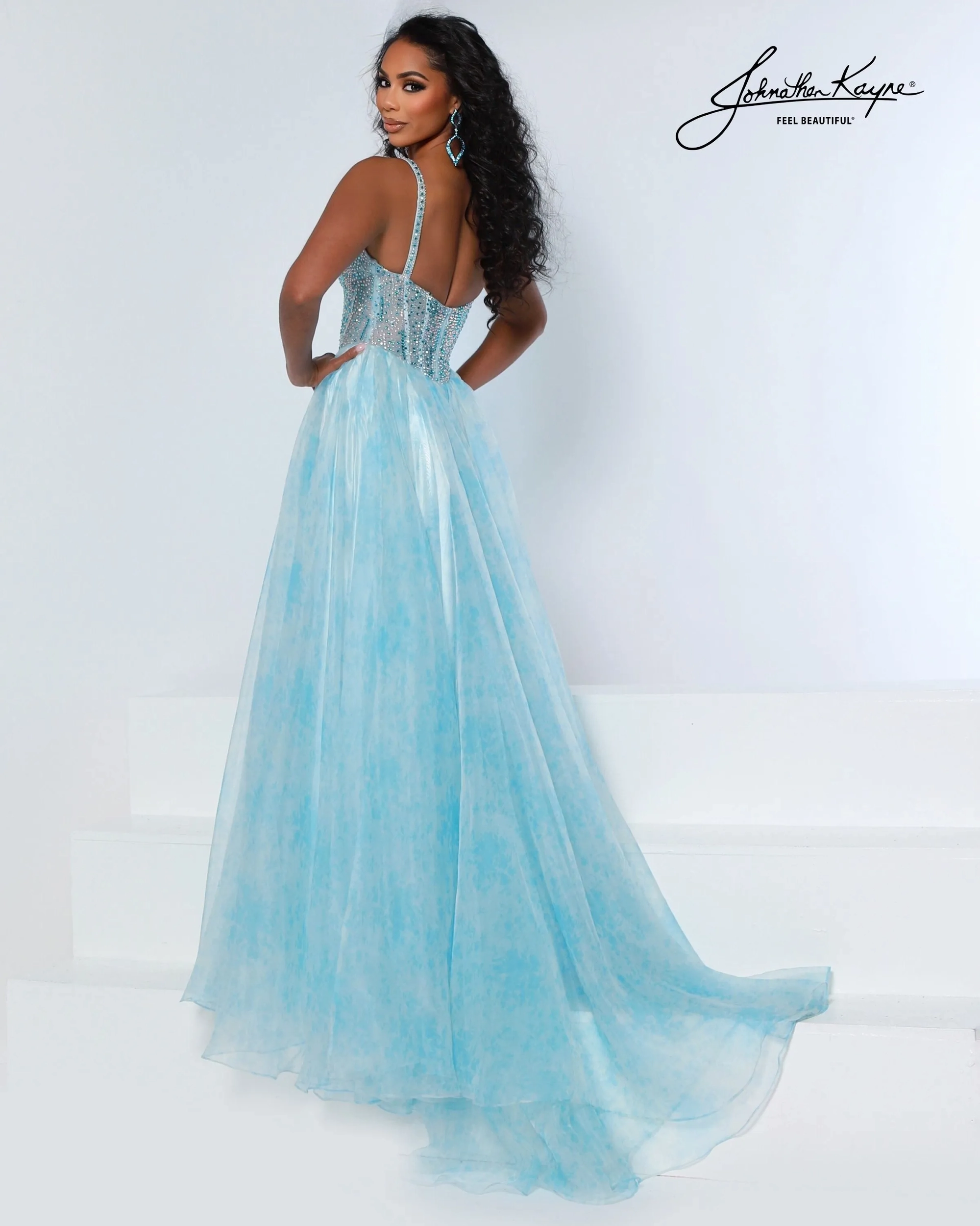 Light up the room in this dreamy printed poly organza ballgown adorned with crystal embellished exposed boning bodice, plunging neckline, defined waist, and daring slit. Ideal for red-carpet entrances or prom nights that call for pure sparkle.