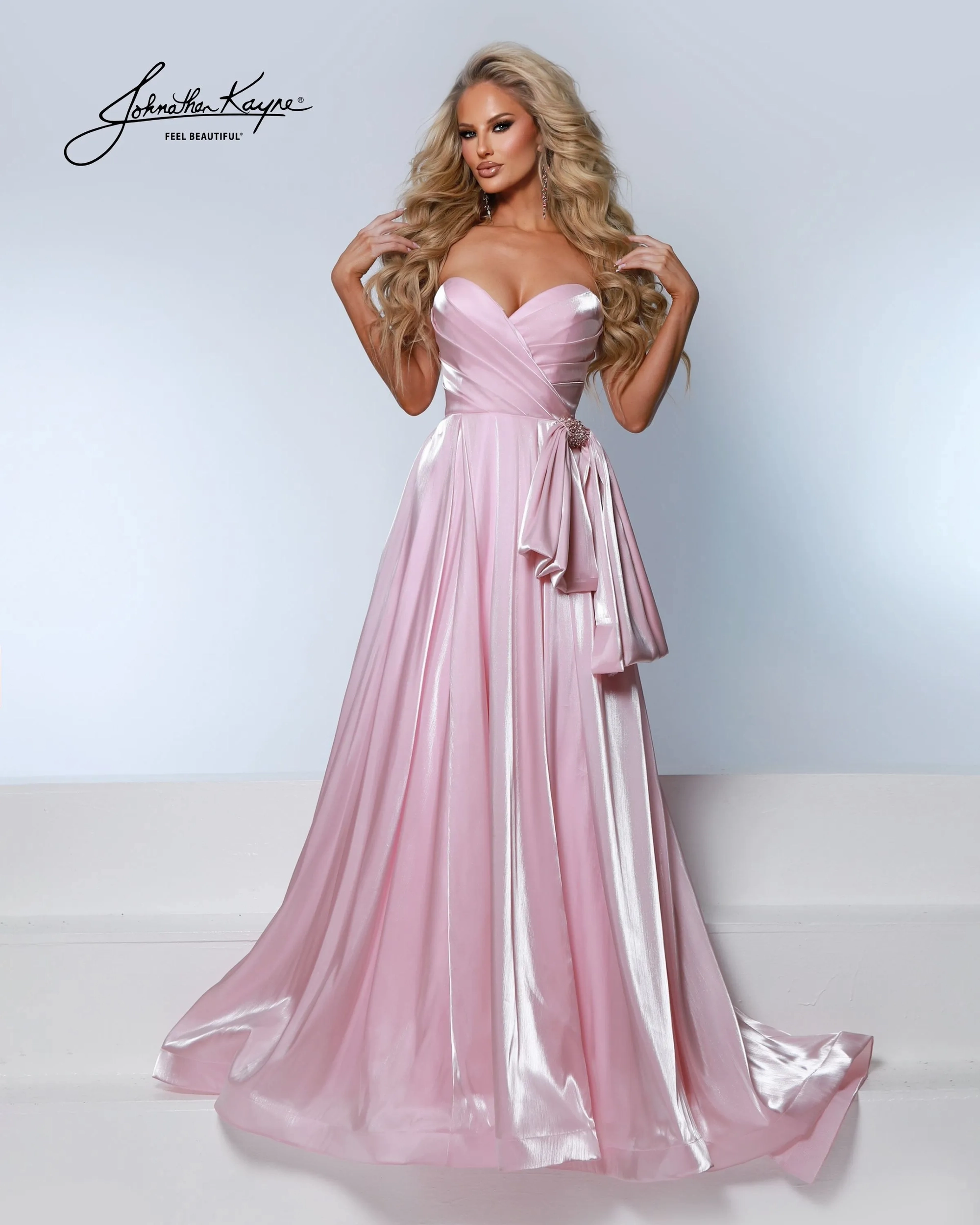 Soft yet stunning, this chrome organza A-line gown radiates red-carpet shine. The strapless sweetheart neckline, pleated bodice, and draped side sash create a timeless silhouette that flatters every curve. The luminous finish gives off a liquid-metal glow making it a flawless choice for evening wear or any event where you want to shimmer with confidence.